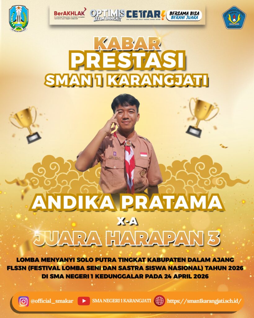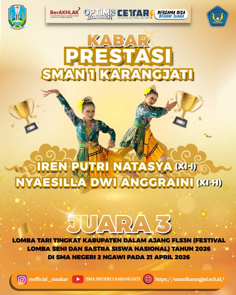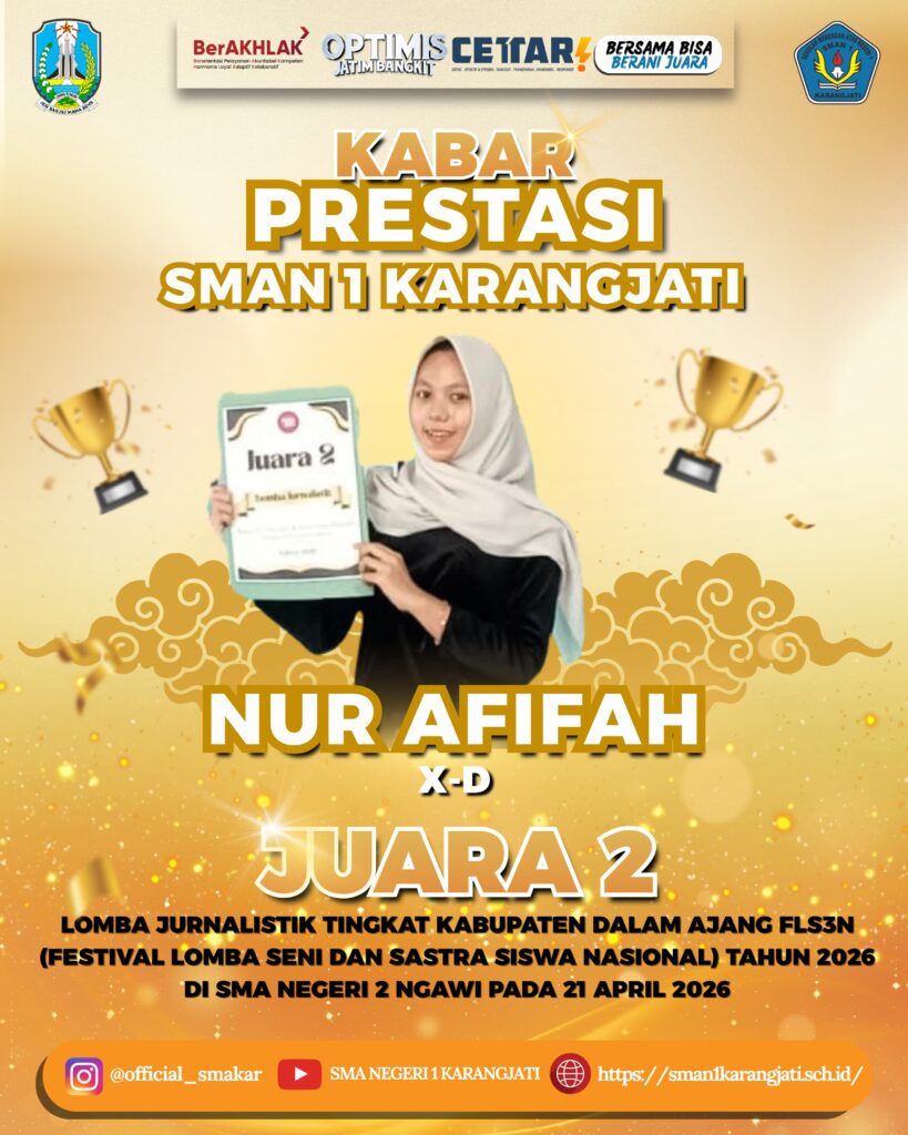 SMAKAR NEWS: Kabar membanggakan datang dari SMAN 1 Karangjati. Sebanyak empat siswa berhasil menyabet medali dalam ajang Festival Lomba Seni dan Sastra Siswa Nasional (FLS3N) tingkat Kabupaten Ngawi tahun 2026. Meski tidak ada yang berhasil meraih posisi juara 1, prestasi ini tetap dinilai luar biasa mengingat ketatnya persaingan antar sekolah.